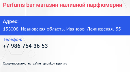 Perfums bar, магазин наливной парфюмерии по адресу 153008, Ивановская область, Иваново, Лежневская, 55 в дальнейшем Организация, размещена в следующих категориях: