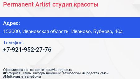 Permanent Artist, студия красоты по адресу 153000, Ивановская область, Иваново, Бубнова, 40а в дальнейшем Организация, размещена в следующих категориях: