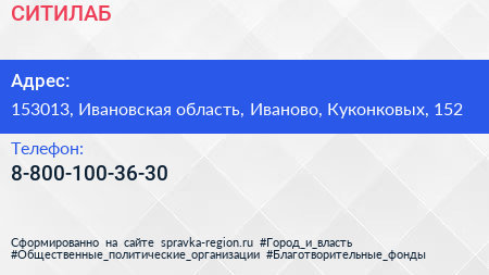 СИТИЛАБ по адресу 153013, Ивановская область, Иваново, Куконковых, 152 в дальнейшем Организация, размещена в следующих категориях: