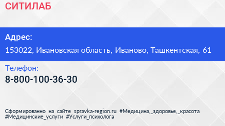 СИТИЛАБ по адресу 153022, Ивановская область, Иваново, Ташкентская, 61 в дальнейшем Организация, размещена в следующих категориях:
