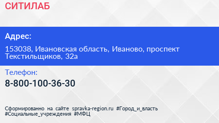 СИТИЛАБ по адресу 153038, Ивановская область, Иваново, проспект Текстильщиков, 32а в дальнейшем Организация, размещена в следующих категориях: