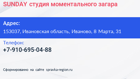 SUNDAY, студия моментального загара по адресу 153037, Ивановская область, Иваново, 8 Марта, 31 в дальнейшем Организация, размещена в следующих категориях: