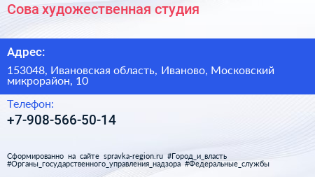 Сова, художественная студия по адресу 153048, Ивановская область, Иваново, Московский микрорайон, 10 в дальнейшем Организация, размещена в следующих категориях: