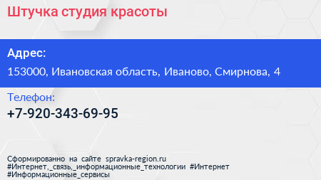Штучка, студия красоты по адресу 153000, Ивановская область, Иваново, Смирнова, 4 в дальнейшем Организация, размещена в следующих категориях: