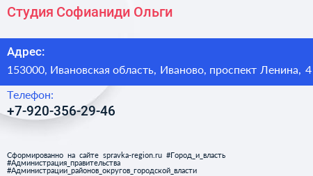 Студия Софианиди Ольги по адресу 153000, Ивановская область, Иваново, проспект Ленина, 4 в дальнейшем Организация, размещена в следующих категориях: