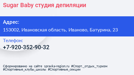 Sugar Baby, студия депиляции по адресу 153002, Ивановская область, Иваново, Батурина, 23 в дальнейшем Организация, размещена в следующих категориях: