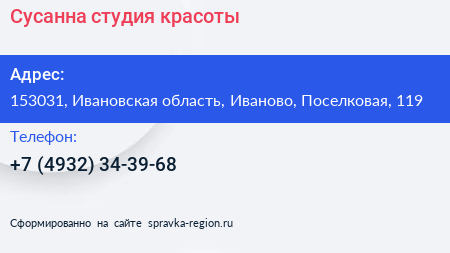 Сусанна, студия красоты по адресу 153031, Ивановская область, Иваново, Поселковая, 119 в дальнейшем Организация, размещена в следующих категориях: