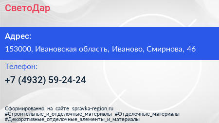 СветоДар по адресу 153000, Ивановская область, Иваново, Смирнова, 46 в дальнейшем Организация, размещена в следующих категориях: