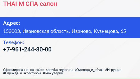 THAI`M, СПА-салон по адресу 153003, Ивановская область, Иваново, Кузнецова, 65 в дальнейшем Организация, размещена в следующих категориях: