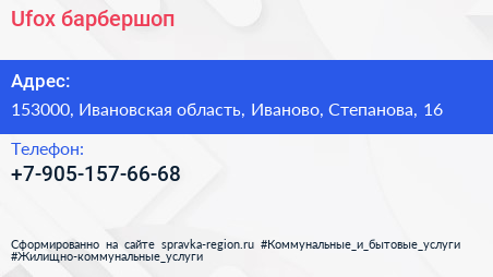 Ufox, барбершоп по адресу 153000, Ивановская область, Иваново, Степанова, 16 в дальнейшем Организация, размещена в следующих категориях: