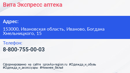 Вита Экспресс, аптека по адресу 153000, Ивановская область, Иваново, Богдана Хмельницкого, 15 в дальнейшем Организация, размещена в следующих категориях: