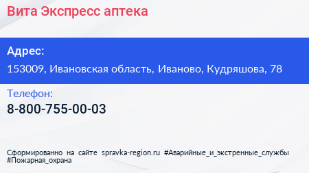Вита Экспресс, аптека по адресу 153009, Ивановская область, Иваново, Кудряшова, 78 в дальнейшем Организация, размещена в следующих категориях:
