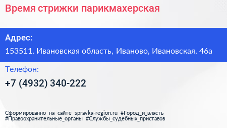 Время стрижки, парикмахерская по адресу 153511, Ивановская область, Иваново, Ивановская, 46а в дальнейшем Организация, размещена в следующих категориях: