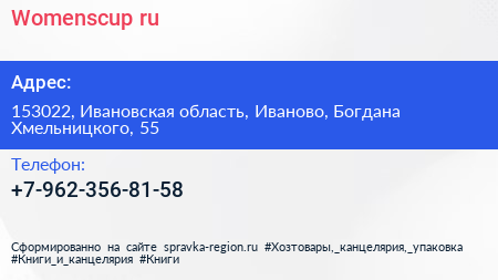 Womenscup.ru по адресу 153022, Ивановская область, Иваново, Богдана Хмельницкого, 55 в дальнейшем Организация, размещена в следующих категориях: