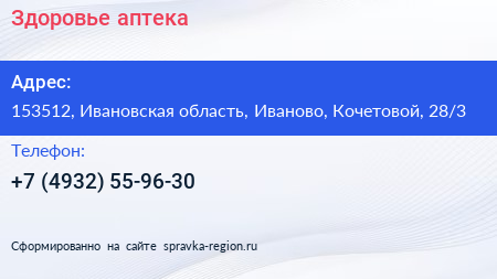 Здоровье, аптека по адресу 153512, Ивановская область, Иваново, Кочетовой, 28/3 в дальнейшем Организация, размещена в следующих категориях: