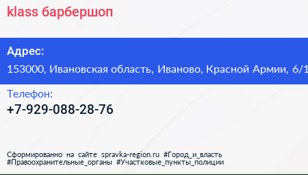 klass, барбершоп по адресу 153000, Ивановская область, Иваново, Красной Армии, 6/1 в дальнейшем Организация, размещена в следующих категориях: