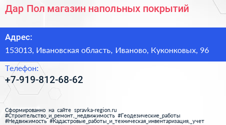 Дар Пол, магазин напольных покрытий по адресу 153013, Ивановская область, Иваново, Куконковых, 96 в дальнейшем Организация, размещена в следующих категориях: