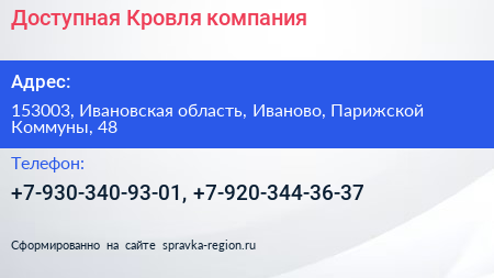 Доступная Кровля, компания по адресу 153003, Ивановская область, Иваново, Парижской Коммуны, 48 в дальнейшем Организация, размещена в следующих категориях: