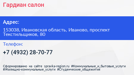 Гардиан, салон по адресу 153038, Ивановская область, Иваново, проспект Текстильщиков, 80 в дальнейшем Организация, размещена в следующих категориях: