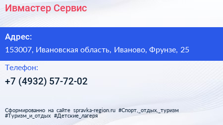 Ивмастер-Сервис по адресу 153007, Ивановская область, Иваново, Фрунзе, 25 в дальнейшем Организация, размещена в следующих категориях: