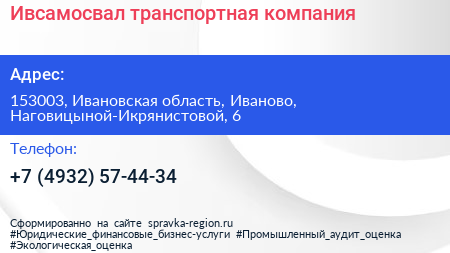 Ивсамосвал, транспортная компания по адресу 153003, Ивановская область, Иваново, Наговицыной-Икрянистовой, 6 в дальнейшем Организация, размещена в следующих категориях: