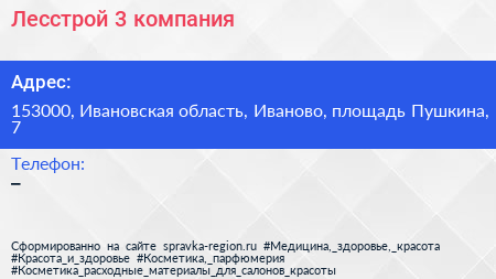 Лесстрой-3, компания по адресу 153000, Ивановская область, Иваново, площадь Пушкина, 7 в дальнейшем Организация, размещена в следующих категориях: