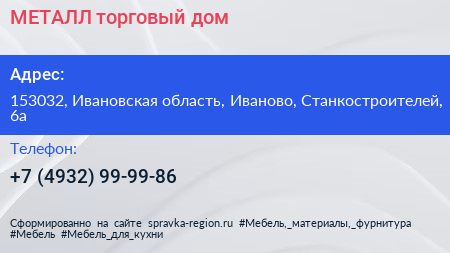 МЕТАЛЛ, торговый дом по адресу 153032, Ивановская область, Иваново, Станкостроителей, 6а в дальнейшем Организация, размещена в следующих категориях: