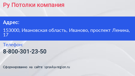 Ру Потолки, компания по адресу 153000, Ивановская область, Иваново, проспект Ленина, 17 в дальнейшем Организация, размещена в следующих категориях: