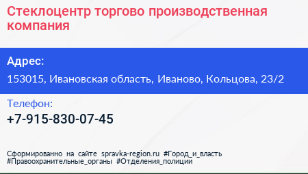 Стеклоцентр, торгово-производственная компания по адресу 153015, Ивановская область, Иваново, Кольцова, 23/2 в дальнейшем Организация, размещена в следующих категориях:
