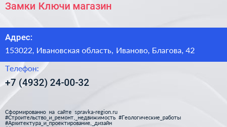 Замки-Ключи, магазин по адресу 153022, Ивановская область, Иваново, Благова, 42 в дальнейшем Организация, размещена в следующих категориях: