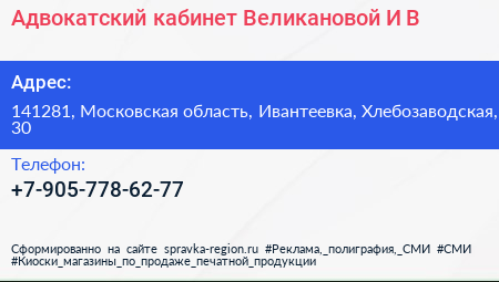 Адвокатский кабинет Великановой И.В. по адресу 141281, Московская область, Ивантеевка, Хлебозаводская, 30 в дальнейшем Организация, размещена в следующих категориях: