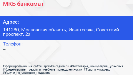 МКБ, банкомат по адресу 141280, Московская область, Ивантеевка, Советский проспект, 2а в дальнейшем Организация, размещена в следующих категориях: