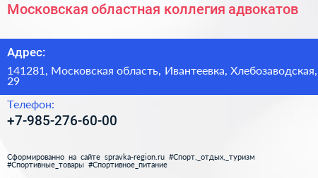 Московская областная коллегия адвокатов по адресу 141281, Московская область, Ивантеевка, Хлебозаводская, 29 в дальнейшем Организация, размещена в следующих категориях: