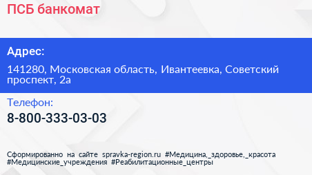 ПСБ, банкомат по адресу 141280, Московская область, Ивантеевка, Советский проспект, 2а в дальнейшем Организация, размещена в следующих категориях: