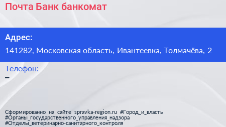 Почта Банк, банкомат по адресу 141282, Московская область, Ивантеевка, Толмачёва, 2 в дальнейшем Организация, размещена в следующих категориях: