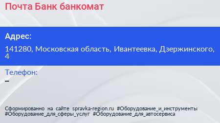 Почта Банк, банкомат по адресу 141280, Московская область, Ивантеевка, Дзержинского, 4 в дальнейшем Организация, размещена в следующих категориях: