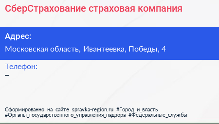 СберСтрахование, страховая компания по адресу Московская область, Ивантеевка, Победы, 4 в дальнейшем Организация, размещена в следующих категориях: