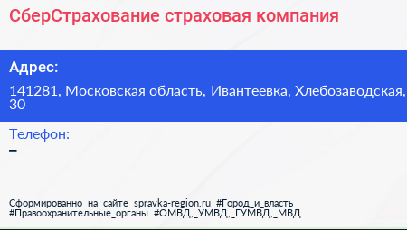СберСтрахование, страховая компания по адресу 141281, Московская область, Ивантеевка, Хлебозаводская, 30 в дальнейшем Организация, размещена в следующих категориях: