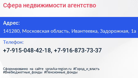 Сфера недвижимости, агентство по адресу 141280, Московская область, Ивантеевка, Задорожная, 1а в дальнейшем Организация, размещена в следующих категориях: