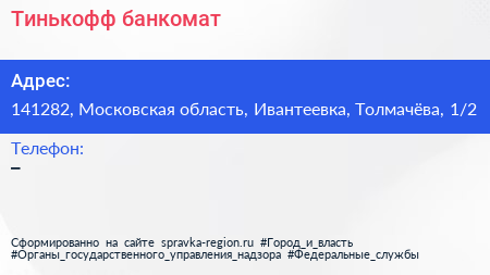 Тинькофф, банкомат по адресу 141282, Московская область, Ивантеевка, Толмачёва, 1/2 в дальнейшем Организация, размещена в следующих категориях:
