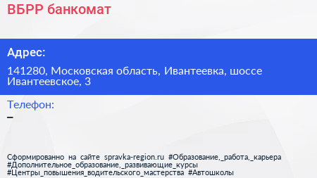 ВБРР, банкомат по адресу 141280, Московская область, Ивантеевка, шоссе Ивантеевское, 3 в дальнейшем Организация, размещена в следующих категориях: