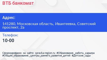 ВТБ, банкомат по адресу 141280, Московская область, Ивантеевка, Советский проспект, 2а в дальнейшем Организация, размещена в следующих категориях: