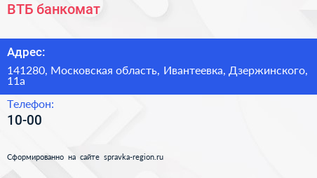 ВТБ, банкомат по адресу 141280, Московская область, Ивантеевка, Дзержинского, 11а в дальнейшем Организация, размещена в следующих категориях: