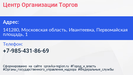 Центр Организации Торгов по адресу 141280, Московская область, Ивантеевка, Первомайская площадь, 1 в дальнейшем Организация, размещена в следующих категориях: