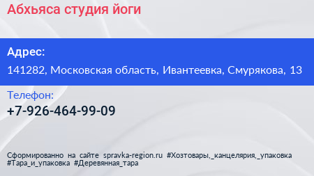 Абхьяса, студия йоги по адресу 141282, Московская область, Ивантеевка, Смурякова, 13 в дальнейшем Организация, размещена в следующих категориях: