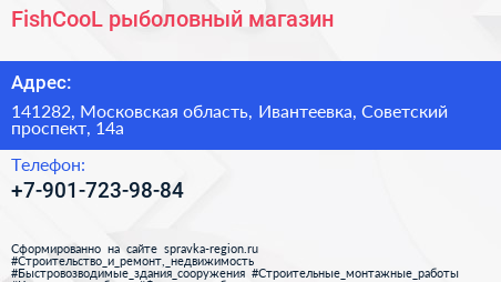FishCooL, рыболовный магазин по адресу 141282, Московская область, Ивантеевка, Советский проспект, 14а в дальнейшем Организация, размещена в следующих категориях: