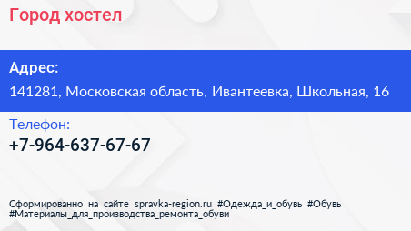 Город, хостел по адресу 141281, Московская область, Ивантеевка, Школьная, 16 в дальнейшем Организация, размещена в следующих категориях: