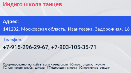 Индиго, школа танцев по адресу 141282, Московская область, Ивантеевка, Задорожная, 16 в дальнейшем Организация, размещена в следующих категориях: