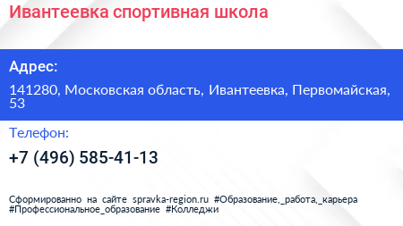 Ивантеевка, спортивная школа по адресу 141280, Московская область, Ивантеевка, Первомайская, 53 в дальнейшем Организация, размещена в следующих категориях: