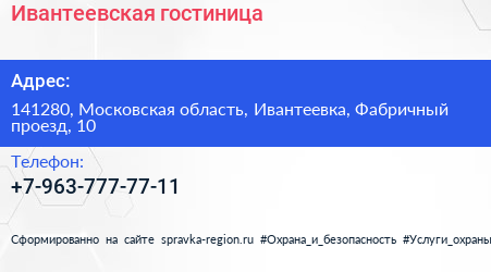 Ивантеевская, гостиница по адресу 141280, Московская область, Ивантеевка, Фабричный проезд, 10 в дальнейшем Организация, размещена в следующих категориях: